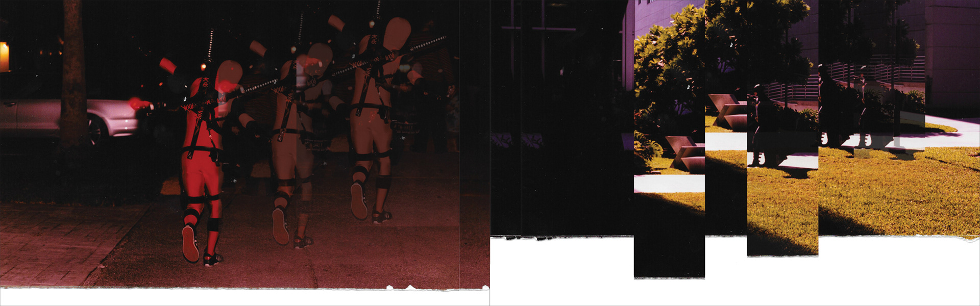 Observe; Juxtapose; Repeat. A series of film photographs were taken in accordance to observing my environments from a specific distance that was unobtrusive but hardly clandestine. I have juxtaposed all this photographs in an order based on a color scale as well as letting the subjects connect and communicate with each other. Through the use of transparency technique and repetition I emphasize a detail in each photo. I use semi colons to separate the words in the title because a semicolon is typically used between two closely related independent clauses ideas.