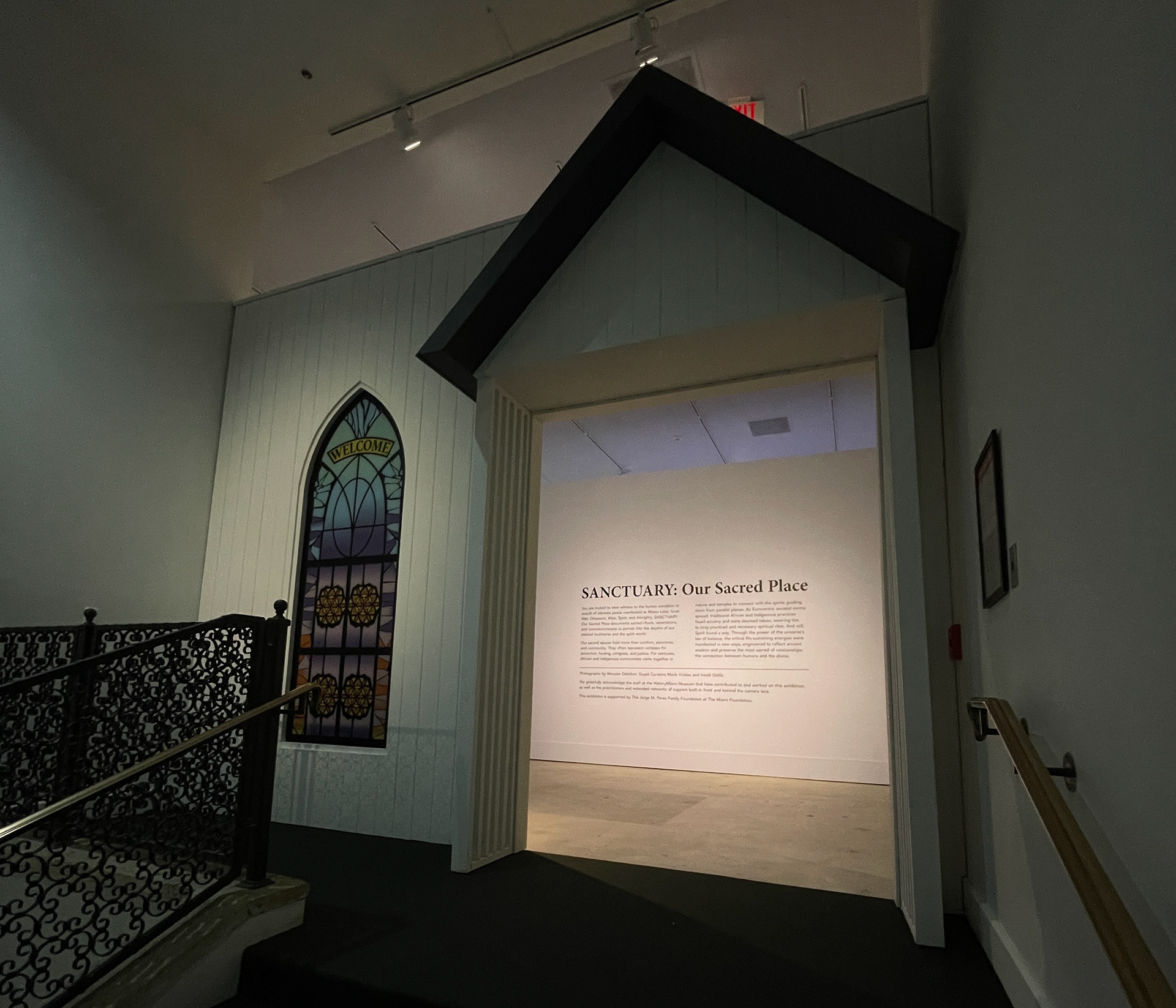 As lead designer, I collaborated with the guest curator and HistoryMiami’s exhibition director to create an immersive exhibition that evokes the feeling of entering a sacred space. The entrance before the intro wall features a nondenominational, church inspired structure with a custom faux stained glass, I designed to feel familiar yet inclusive acting as an integral part of the architectural concept. The stained glass “Welcome” design pays a small homage to an archival photo of one of South Florida’s oldest Baptist churches. The choice of a multicolor palette was to symbolize inclusivity across all beliefs.